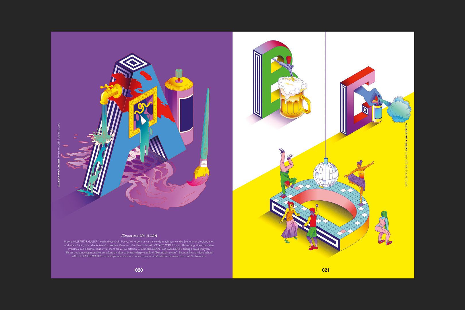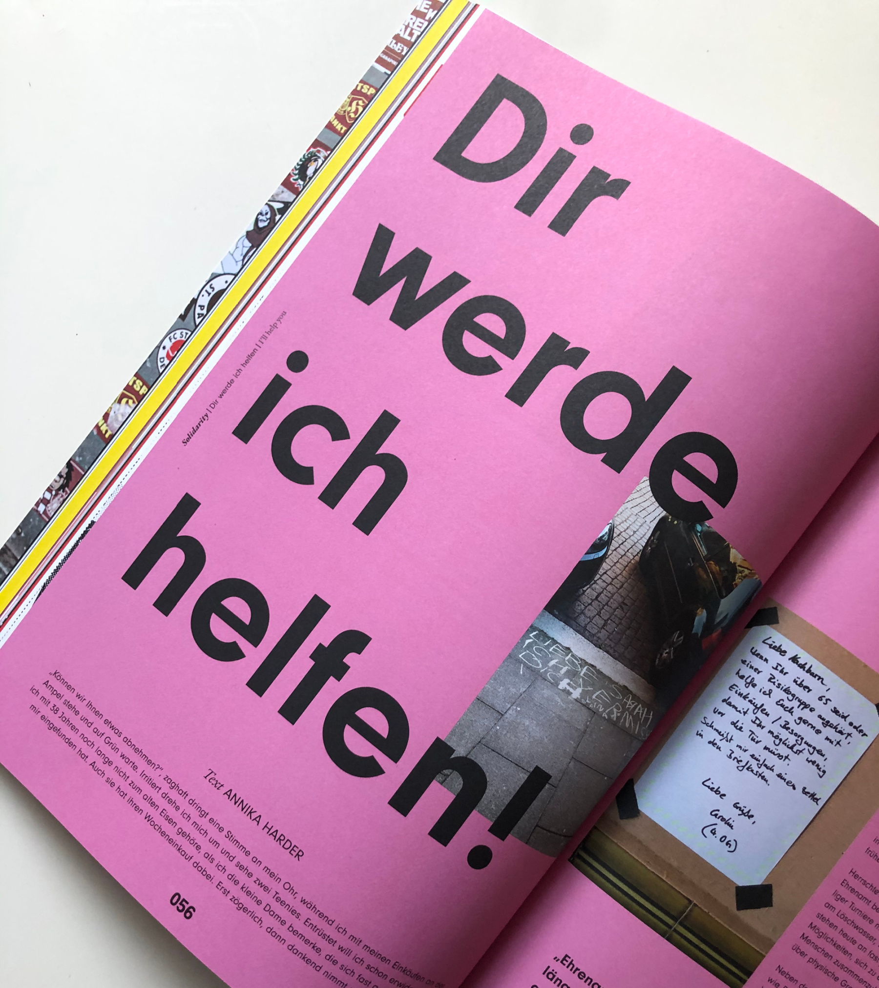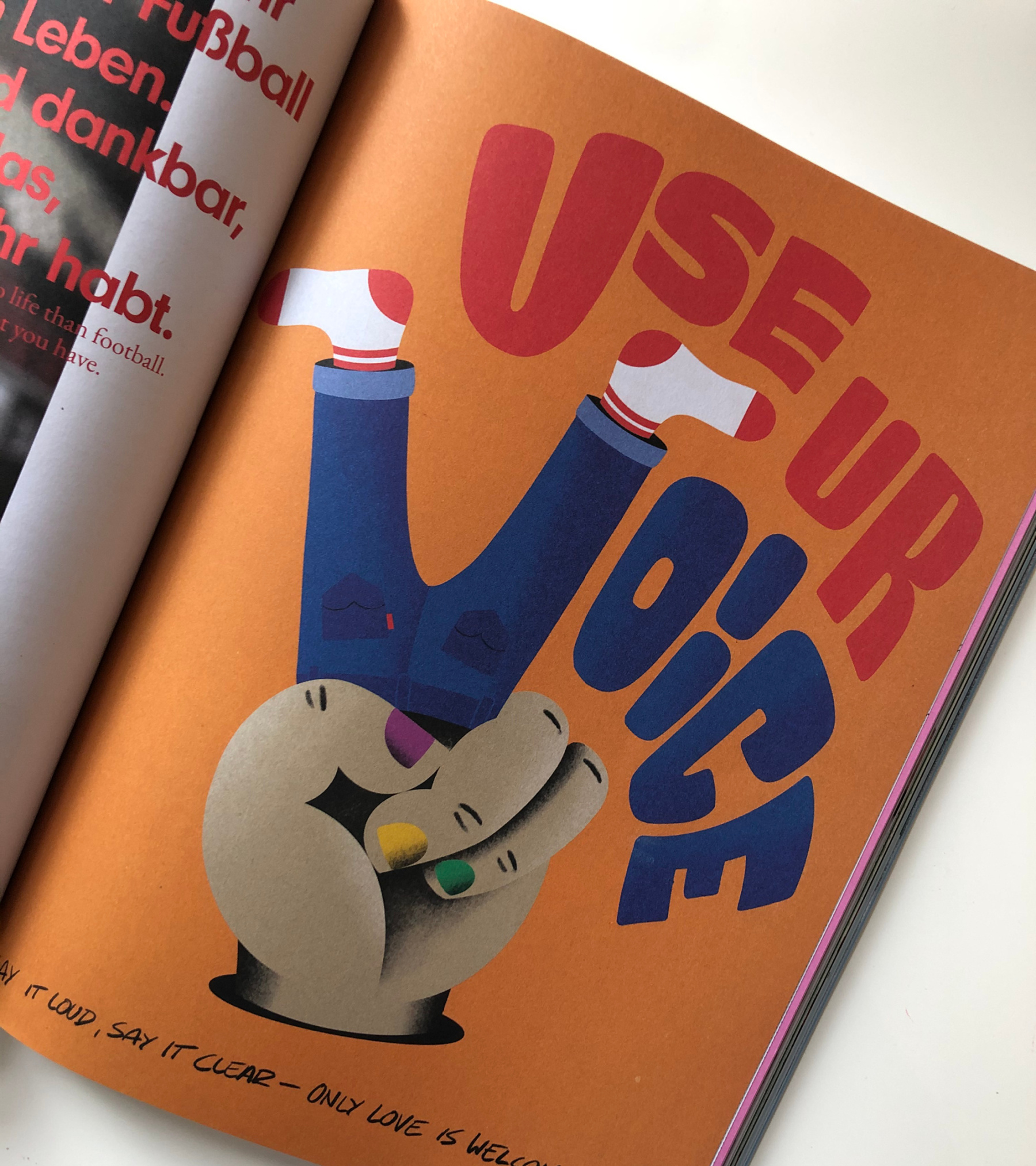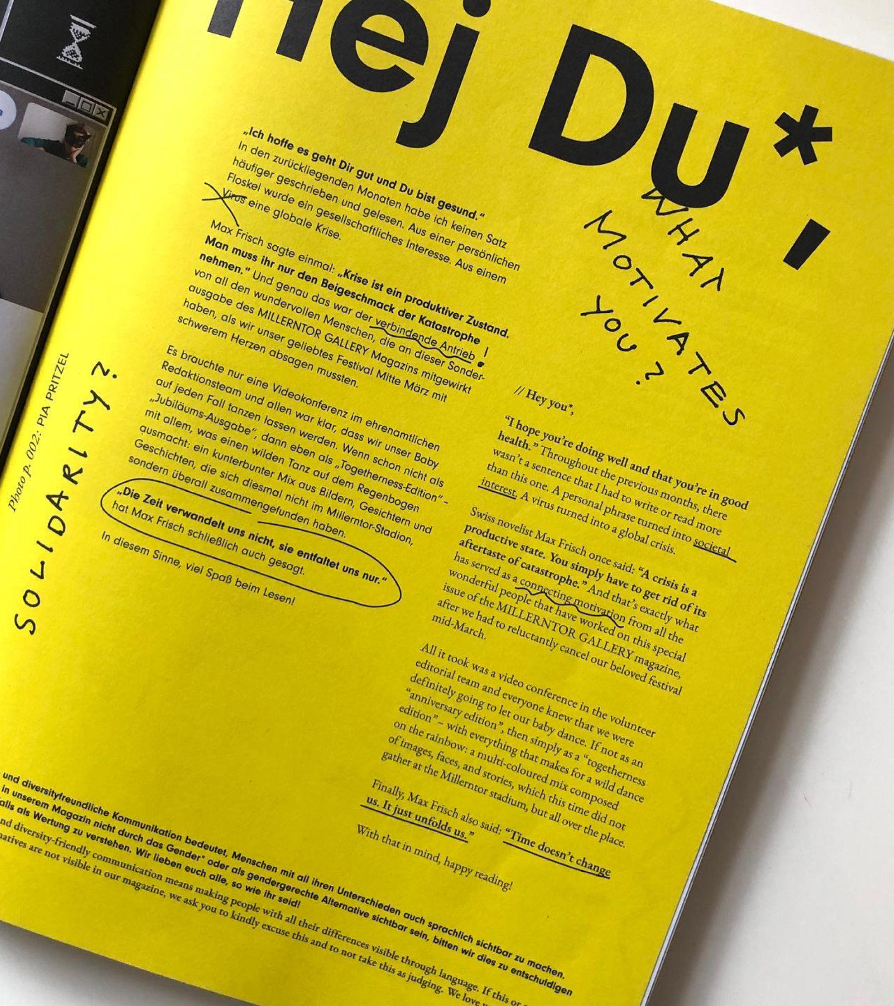 Concept and Editorial Design for the Millerntor Gallery Magazine 2020. For this virtual Millerntor Gallery (we all know that Covid got in the way) we and a team of over 20 volunteer supporters created a multi-coloured mix composed of images, faces and stories – all about „Togetherness“. 204 pages full of art, music, solidarity, strong personalities and talented people.